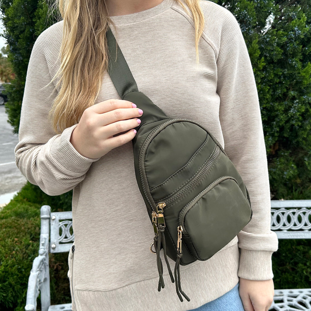 Our best selling crossbody bags are back in stock. We love all of the high end details used on these bags from Urban Expressions. Heavyweight gold hardware and thick nylon make these bags the perfect choice for traveling or just a trip to the grocery store. Your hands are free, and all of your items are securely put away close to your body. The crossbody strap is fully adjustable. Choose from black, olive, or charcoal. $70