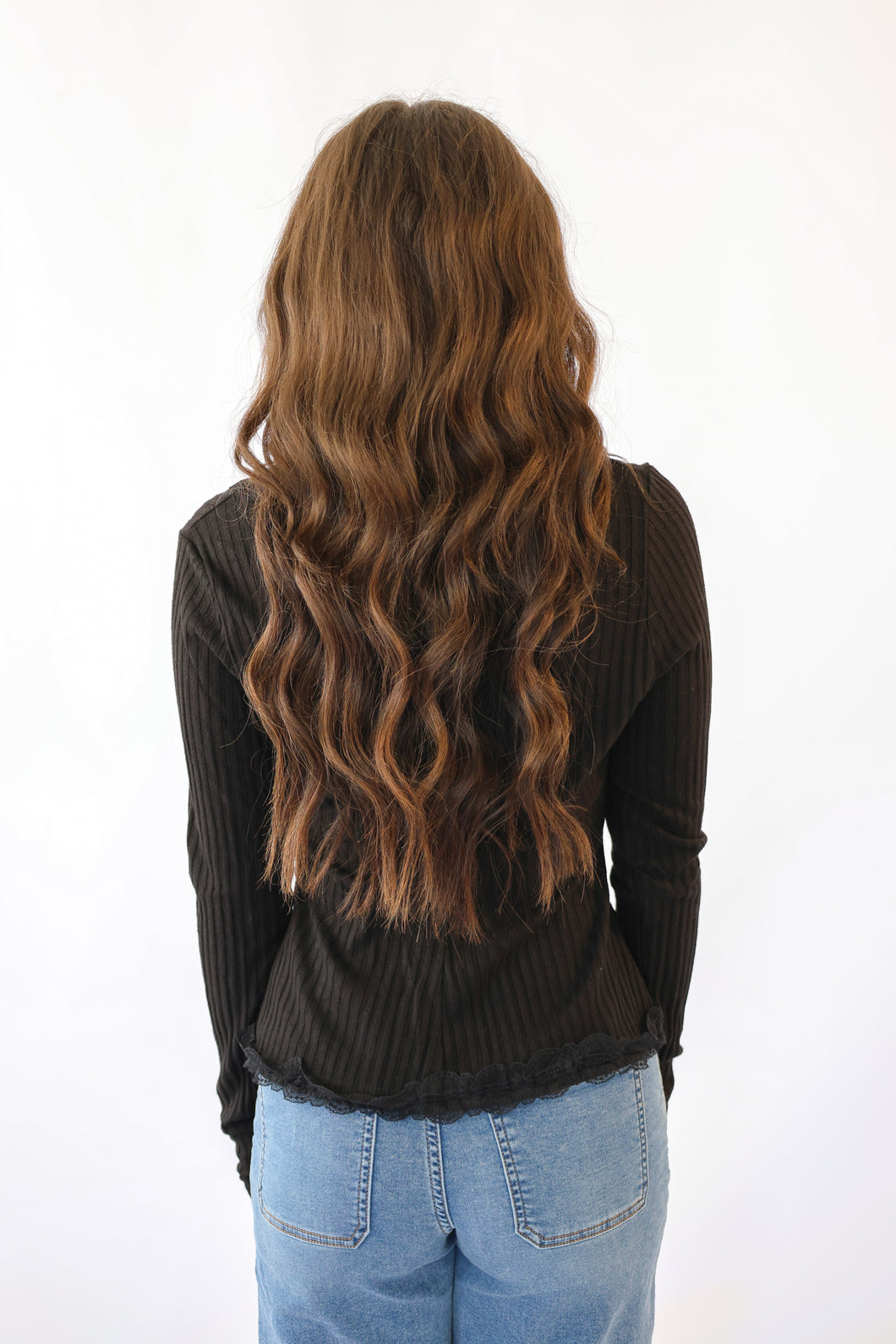 Button Down Lace Trim Fitted Knit Top in Mocha