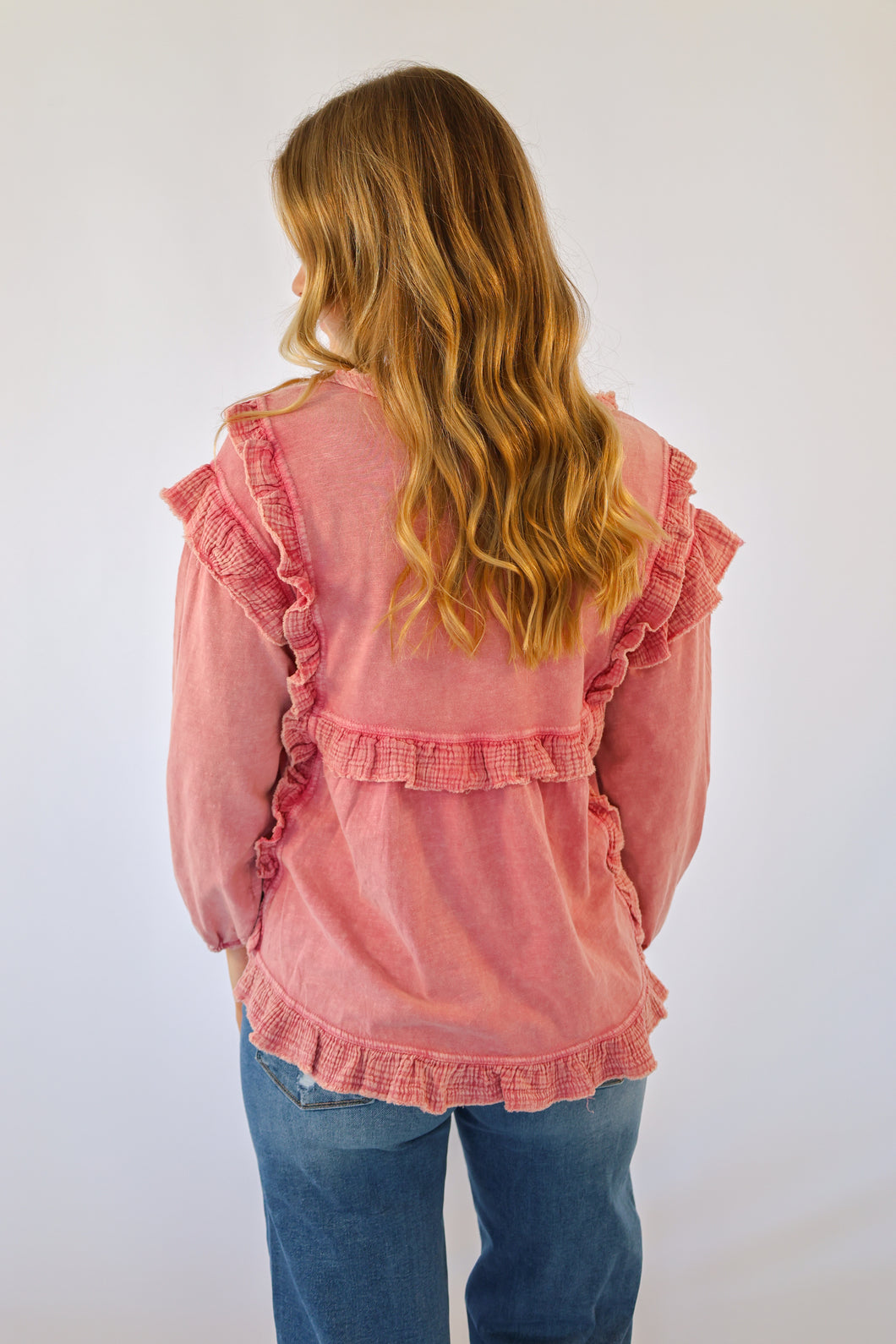 Easel Mineral washed babydoll blouse designed with a round neckline, ruffle trim detail, frayed accents, and 3/4 sleeves with elastic cuffs. Mineral Washed. Pink