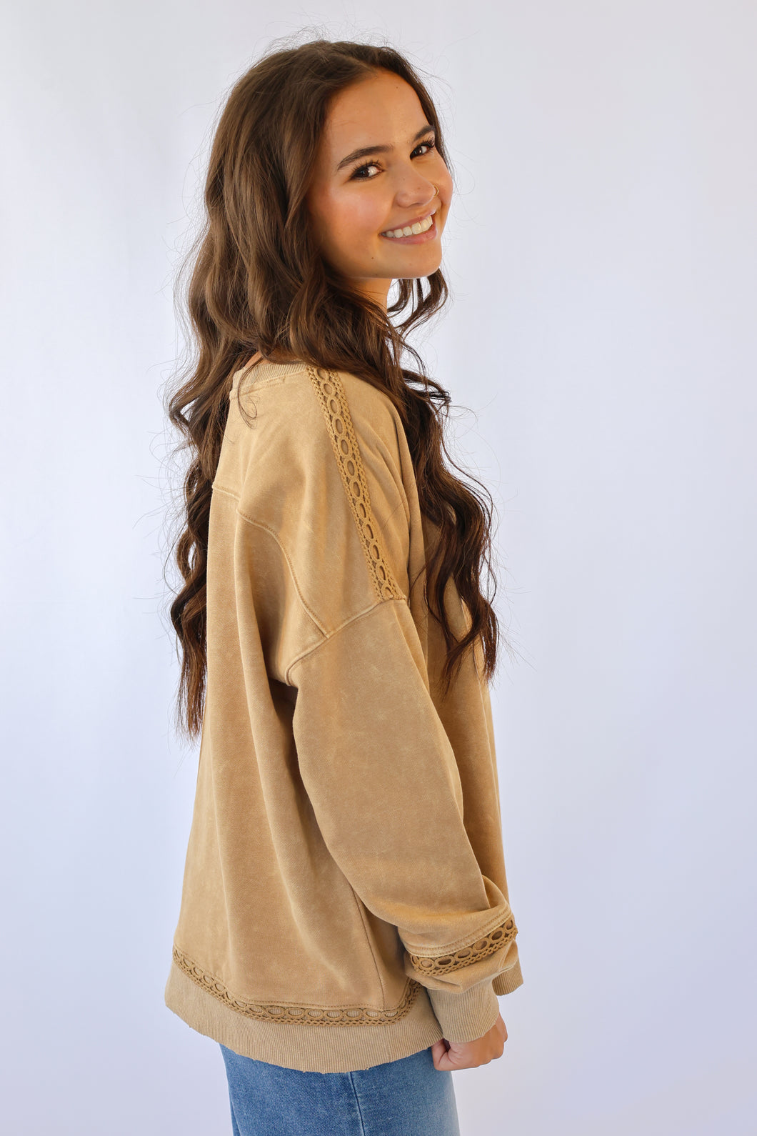 This mineral washed pullover offers a laid-back fit with ribbed trims at the crew neck, cuffs, and hem. Crochet lace inserts embellish the shoulders, sleeves, and hemline, adding a delicate flair. A chest patch pocket adorned with a charming Western boot embroidery brings a fun, vintage-inspired vibe to the look.