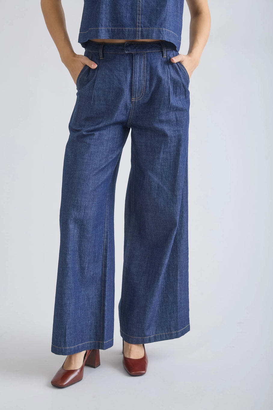 High waistButton zipper closure Belt loops Pockets Front pleat detail Wide leg Full length Denim pants Comes in sizes S, M, and Large. $48