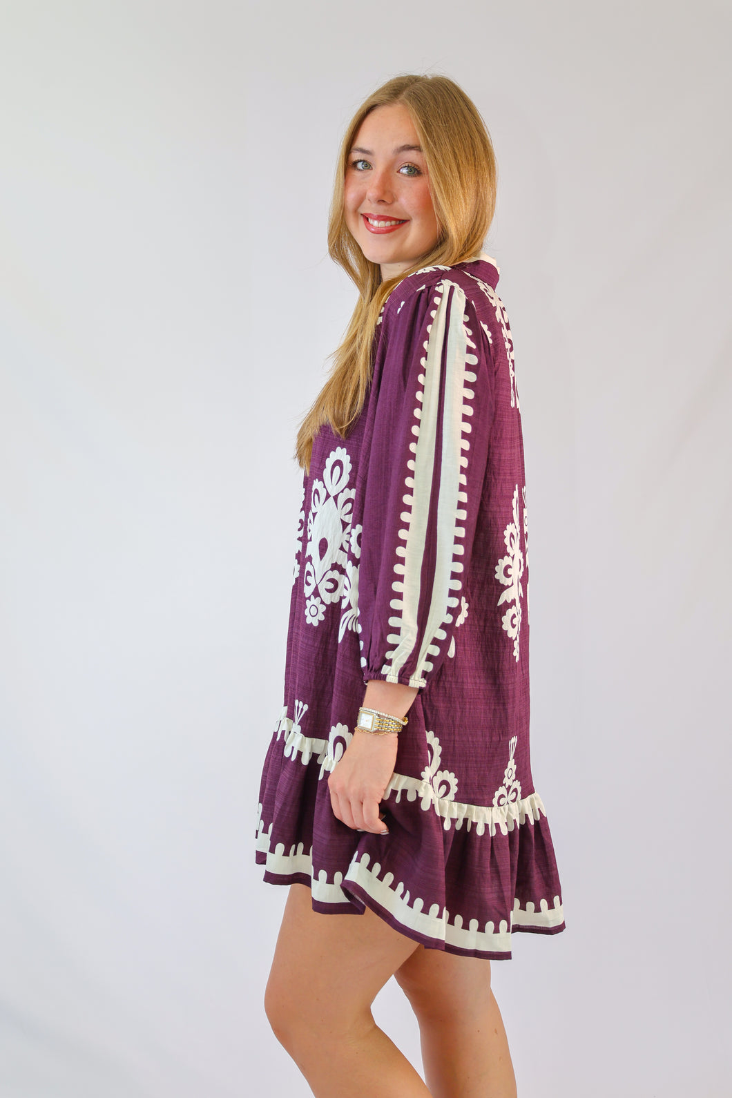 Two Tone Abstract Print Mini Dress in Plum $68