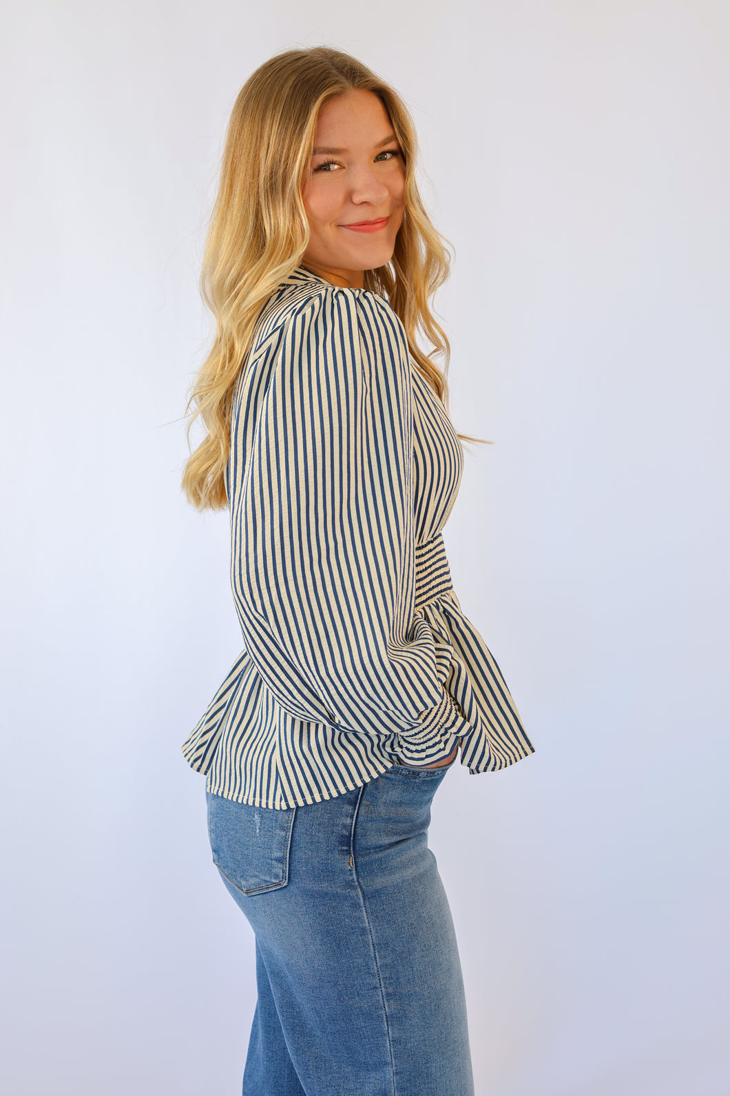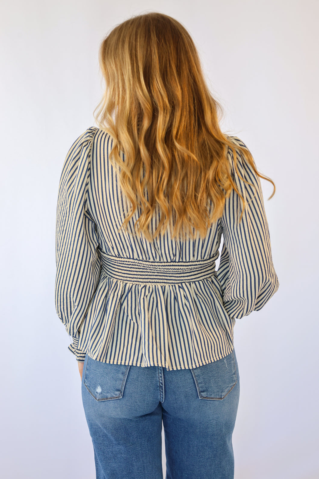 Striped Long Sleeve top featuring wide smocked waist with peplum hem Blue/Cream Stripe . Zipper closure at front. Unlined. Woven. Non-sheer. Lightweight. Model is 5'2 and is wearing a Small. Available in sizes S, M, and L. $56