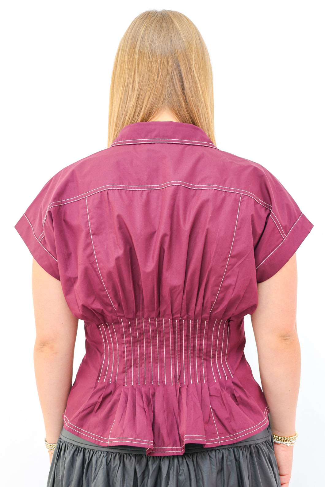 Solid short sleeve peplum top featuring contrast stitched smocked waist in Plum. Button closure at front. Unlined. Woven. Non-sheer. Lightweight.. Model is 6'0 and is wearing a Large. Available in sizes S, M, and L. $60