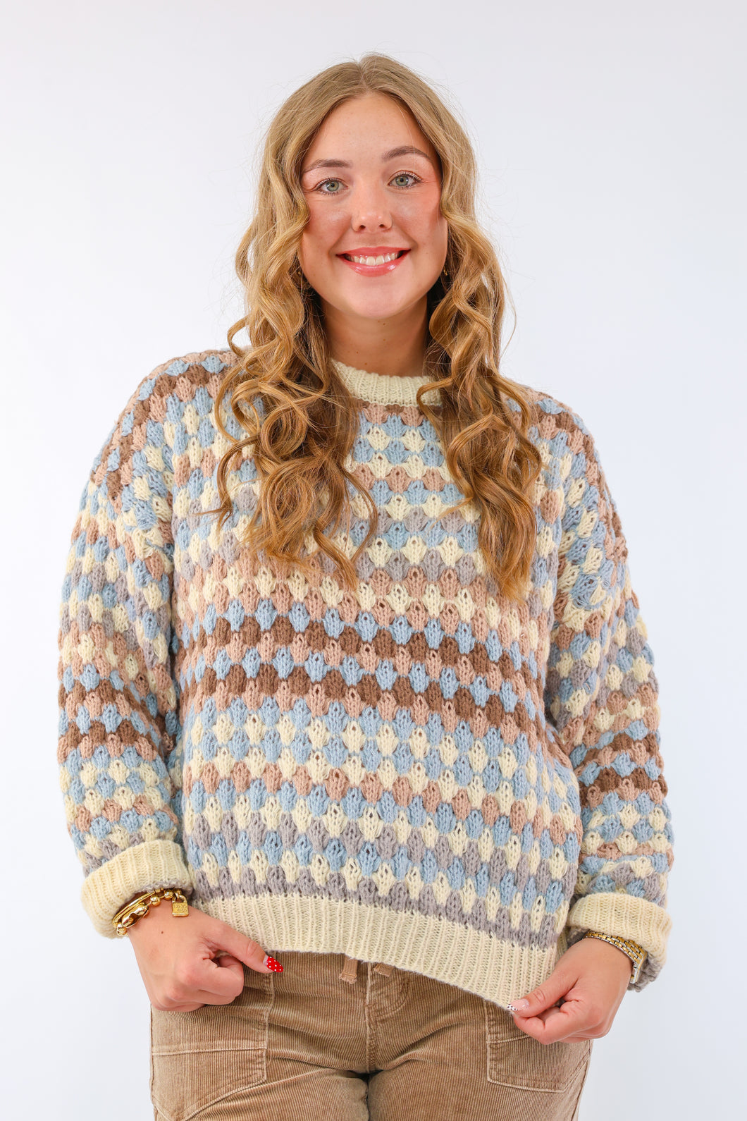 CREWNECK ROUND NECKLINE LONG SLEEVE DROP SHOULDER RELAXED FIT MULTICOLOR CIRCLE PATTERN KNIT PULLOVER SWEATER 100% POLYESTER