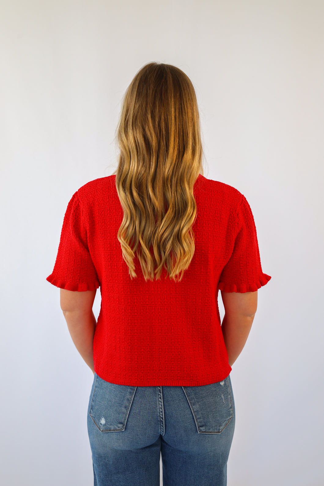 RUFFLED SHORT SLEEVE SWEATER TOP WITH FRONT POCKETS IN RED $70