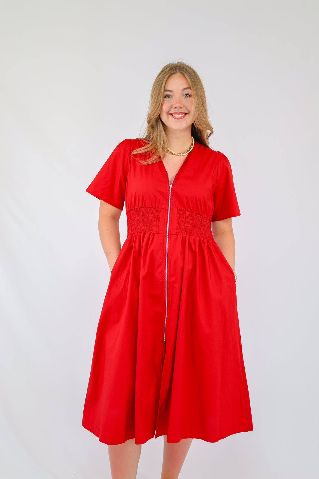 SHORT SLEEVE SMOCKED WAIST FRONT ZIP MIDI DRESS WITH POCKETS