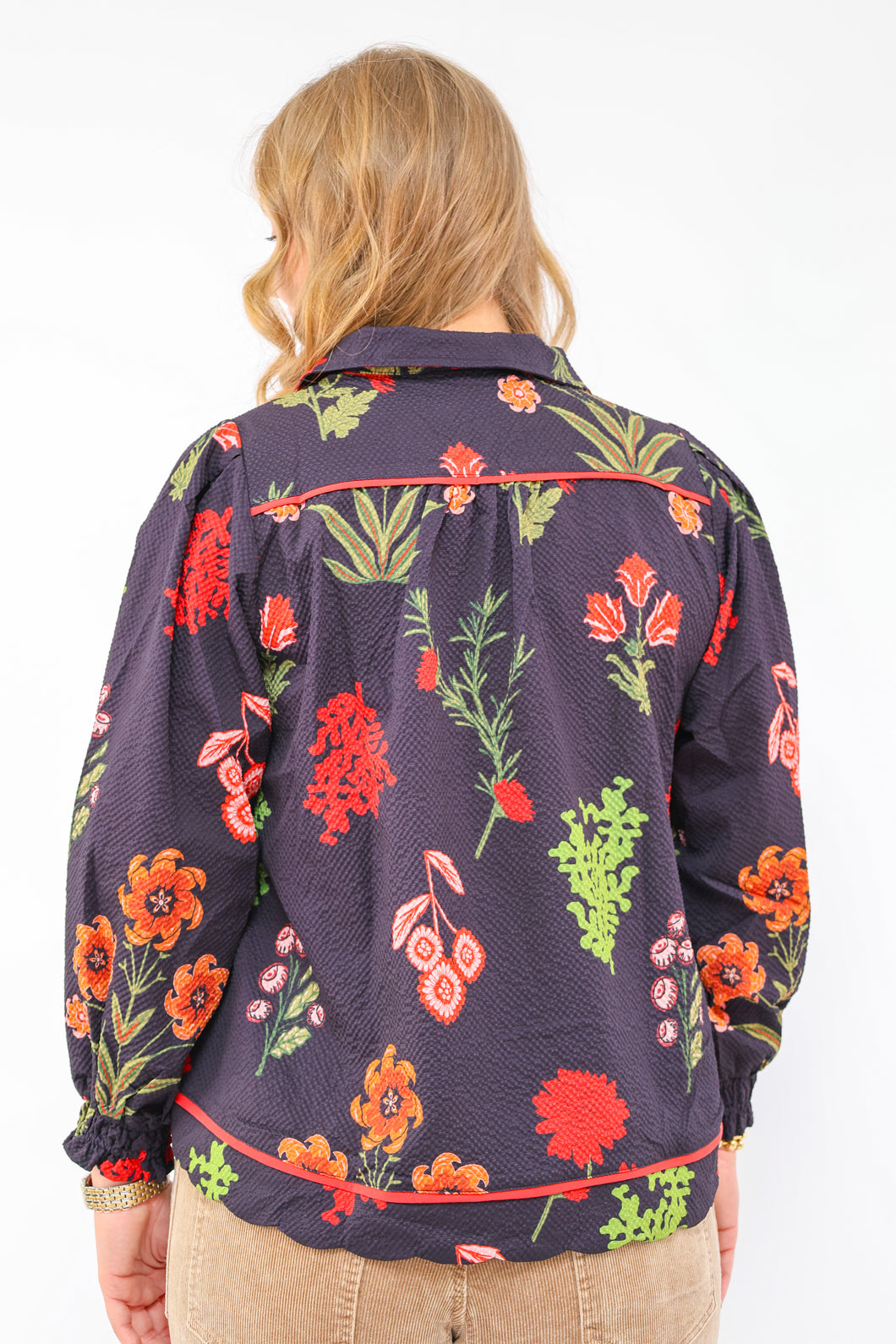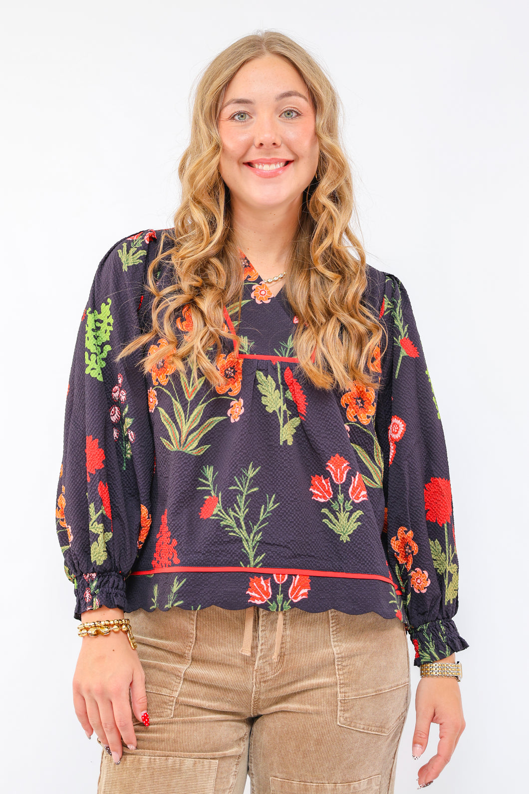 Floral Print Textured Fabric Collared Top in Black $72Key Features• Textured Material• Floral Print• Not LinedFit & Model Notes• Model is 6'0" and is wearing a Medium.• All Measurements are approximate.Fabric Contents• 100% Polyester