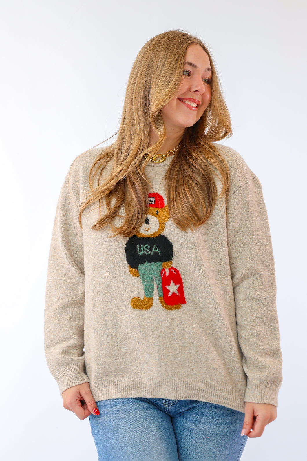 Solid long sleeve sweater knit top featuring bear graphic at front. Ribbed neckline, hem, cuffs. Unlined. Knit. Non-sheer. Medium weight. $74