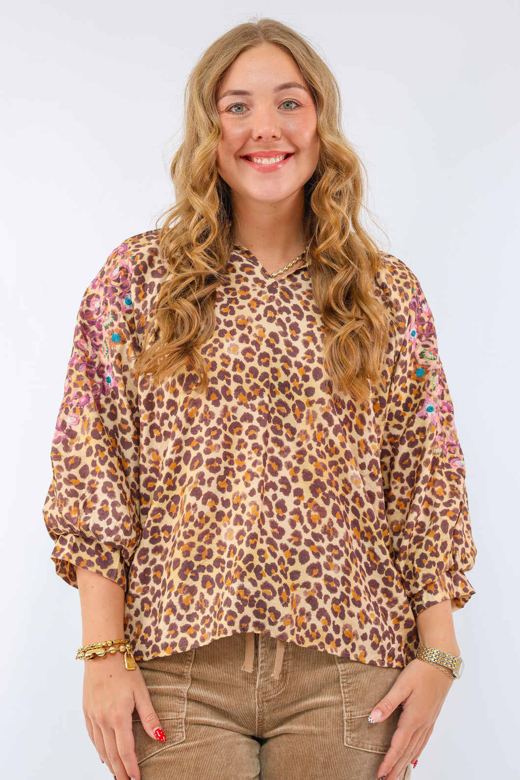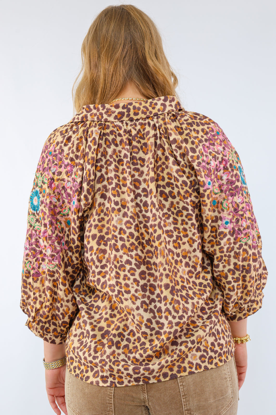 Leopard Print Boho Blouse with Embroidery Sleeves $74