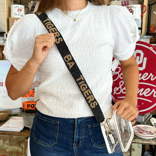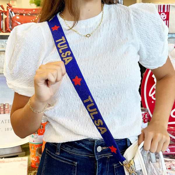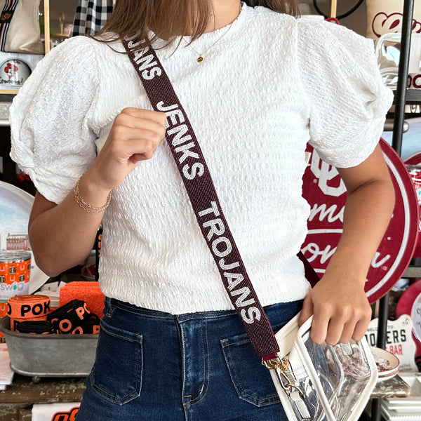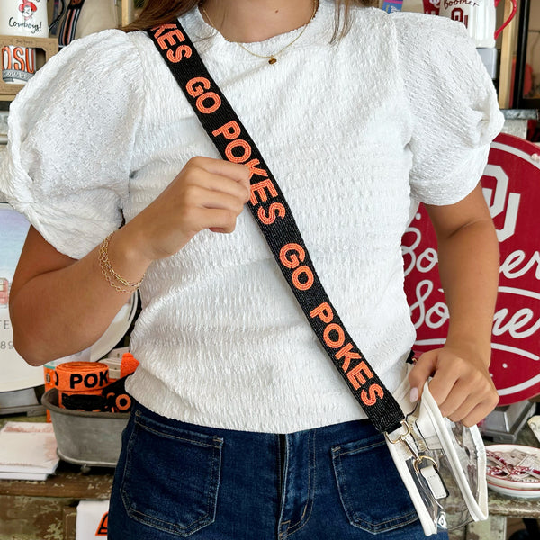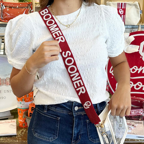 Cheer for the OU Sooners in style with a removable seed bead bag strap. This strap quickly attaches to any cross body bag of your choice. $80