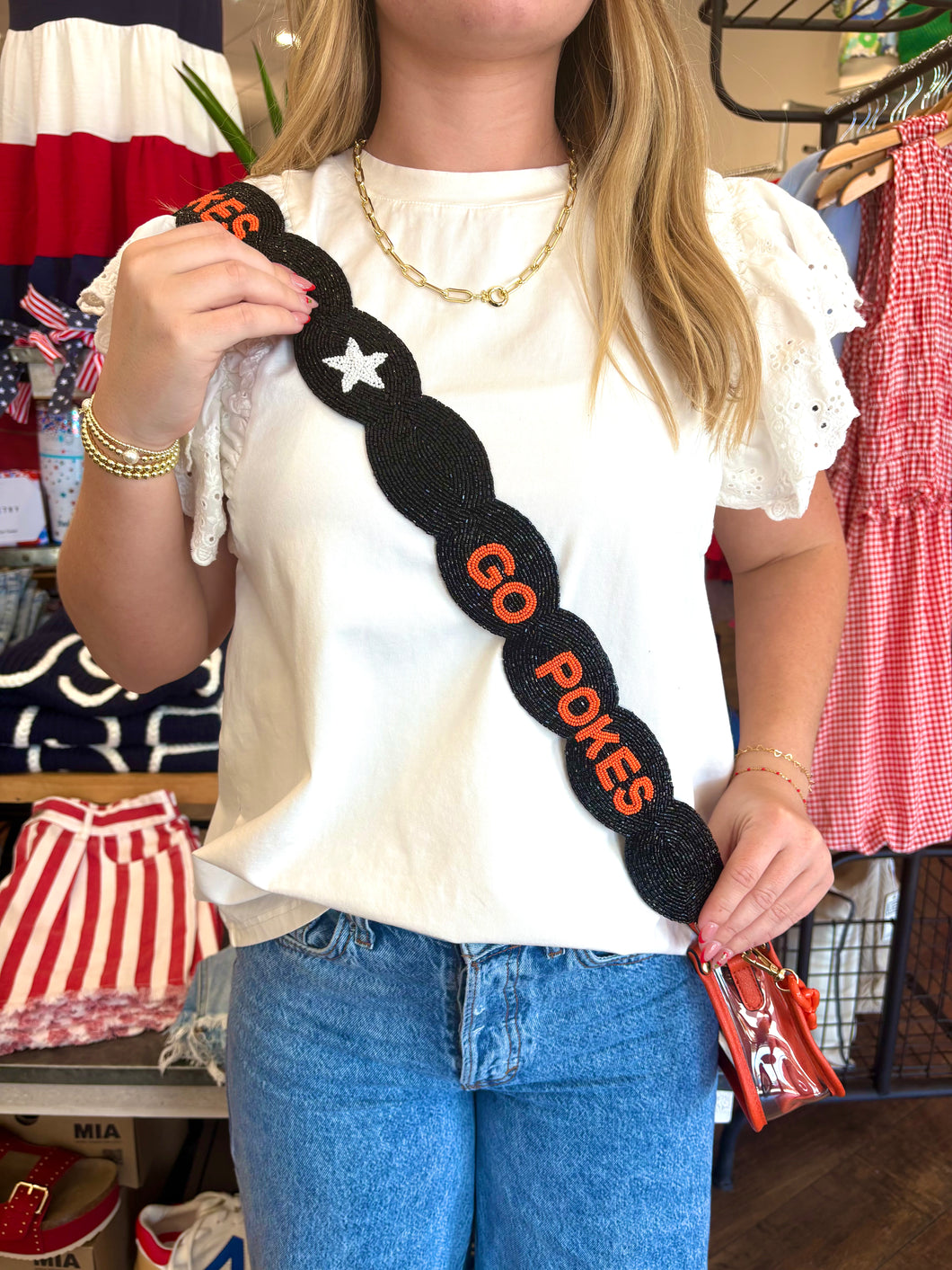Cheer for the OSU Cowboys in style with a removable seed bead bag strap. This strap quickly attaches to any cross body bag of your choice. $80