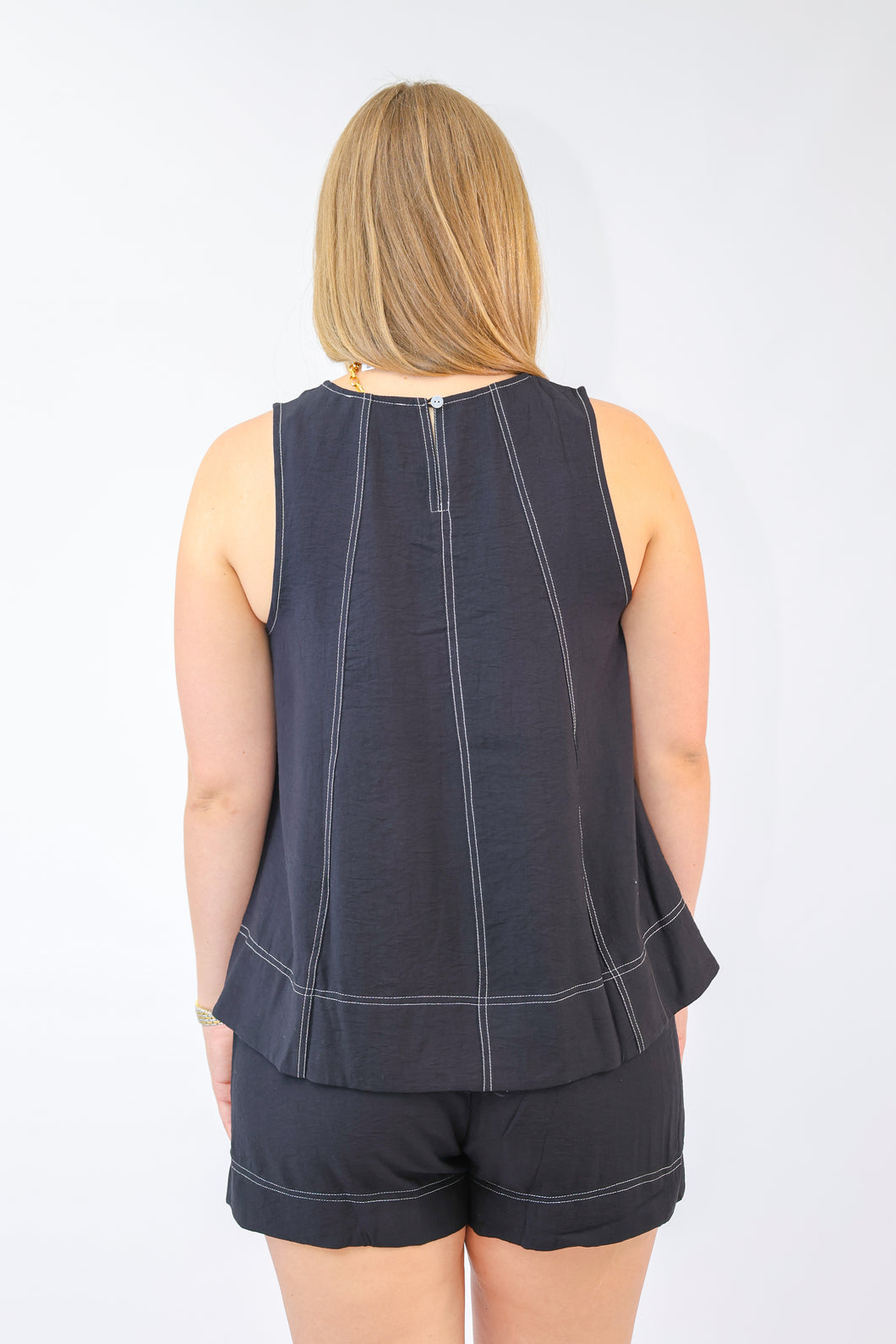 Solid high waist pull-on shorts featuring contrast accented stitching finish cargo pockets at front. Elasticated waistband. Lined. Woven. Non-sheer. Lightweight. $48