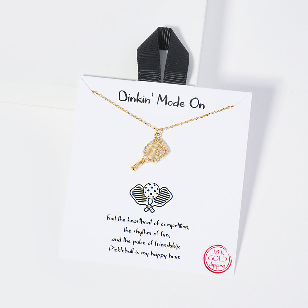 Take your passion for pickleball to another level with our new Dinkin' Mode Necklace. This cute pickleball necklace will add a little sparkle to your game. The necklace is gold dipped over brass and measures 16" plus a two inch extender chain. $24