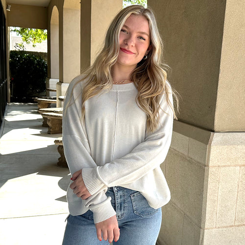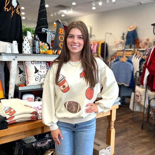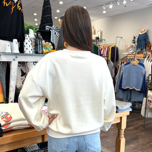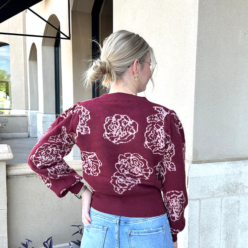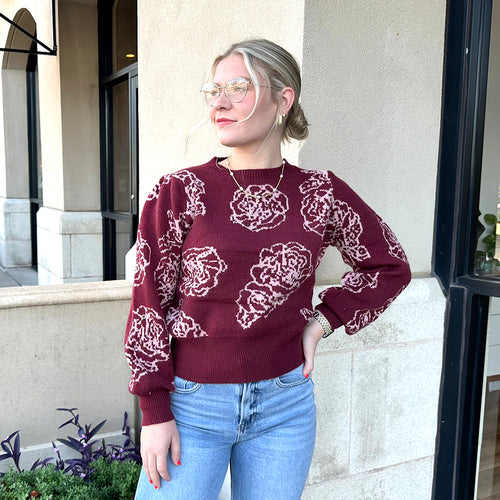 Floral Distressed Crewneck Terry Knit Sweater in Taupe