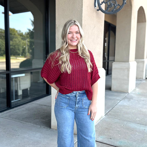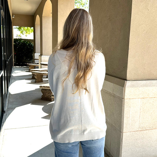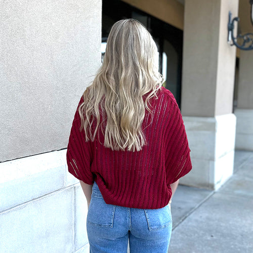 Stripe Mock Neck Drop Shoulder Knit Sweater in Burgandy/Cream