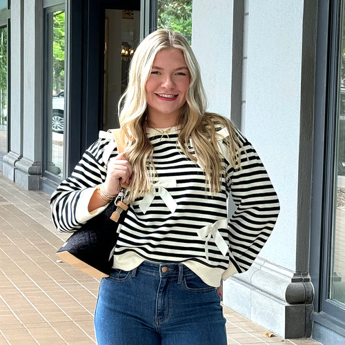 Stripe Side Tie Short Sleeve Knit Sweater in Navy