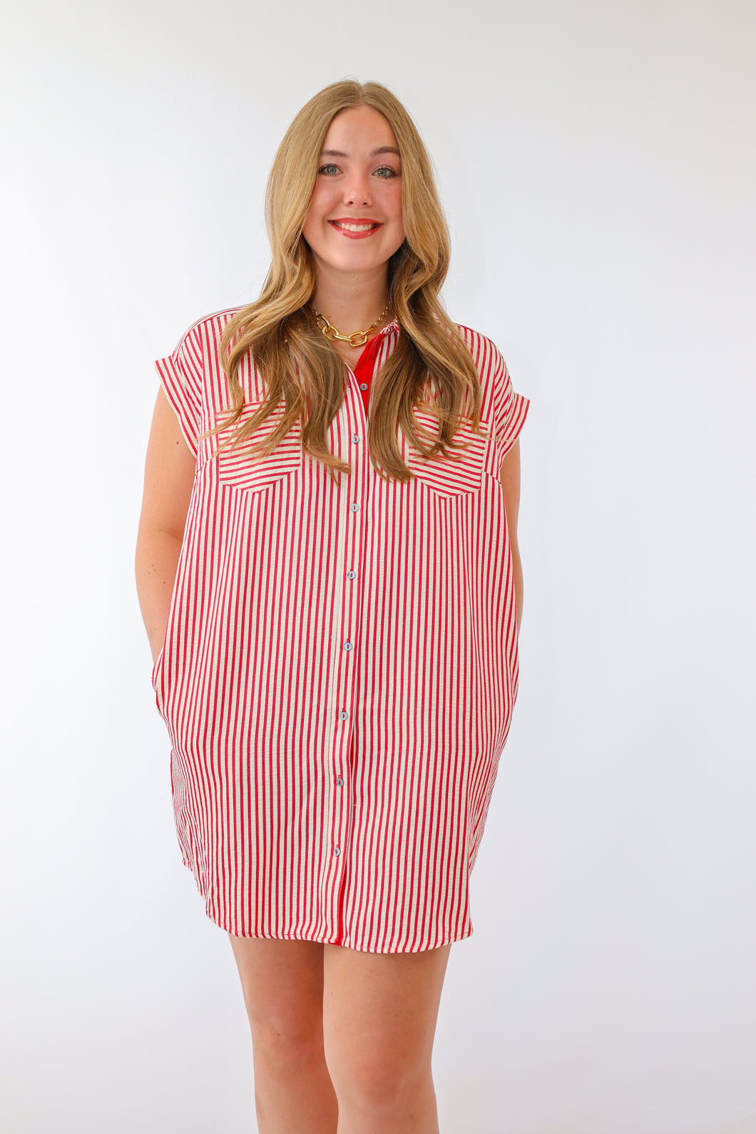 SHORT SLEEVE WOVEN STRIPED BUTTON DOWN SHIRT MINI DRESS WITH POCKETS IN RED. GREAT FOR GAMEDAY $62