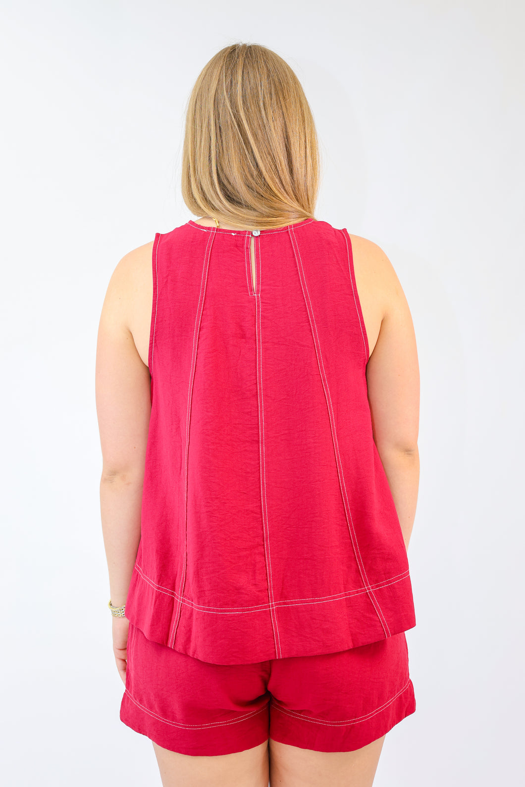 Solid sleeveless pullover top featuring contrast accented exposed stitching. Perfect for Gameday! Single button keyhole closure at back. Unlined. Woven. Non-sheer. Lightweight. $48