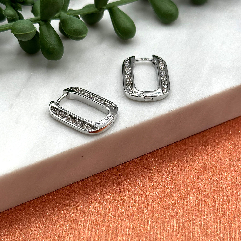 Small in size but large in style, our Atlanta Jeweled Huggies are sure to be a new fave. These silver plated earrings are a take on the paperclip shape and feature pave crystals on the sides. They have huggie styling which means they are so comfortable and measure 1" in length. $18