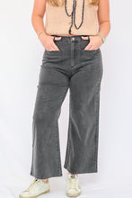 Solid high waisted wide leg ankle length pants featuring patch pockets at front. Faux pocket at back. Belt loops. Button and zipper closure at front. Unlined. Woven. Non-sheer. Lightweight. Model is 6'0 and wearing a size Large. Available in sizes S, M, and L. $72