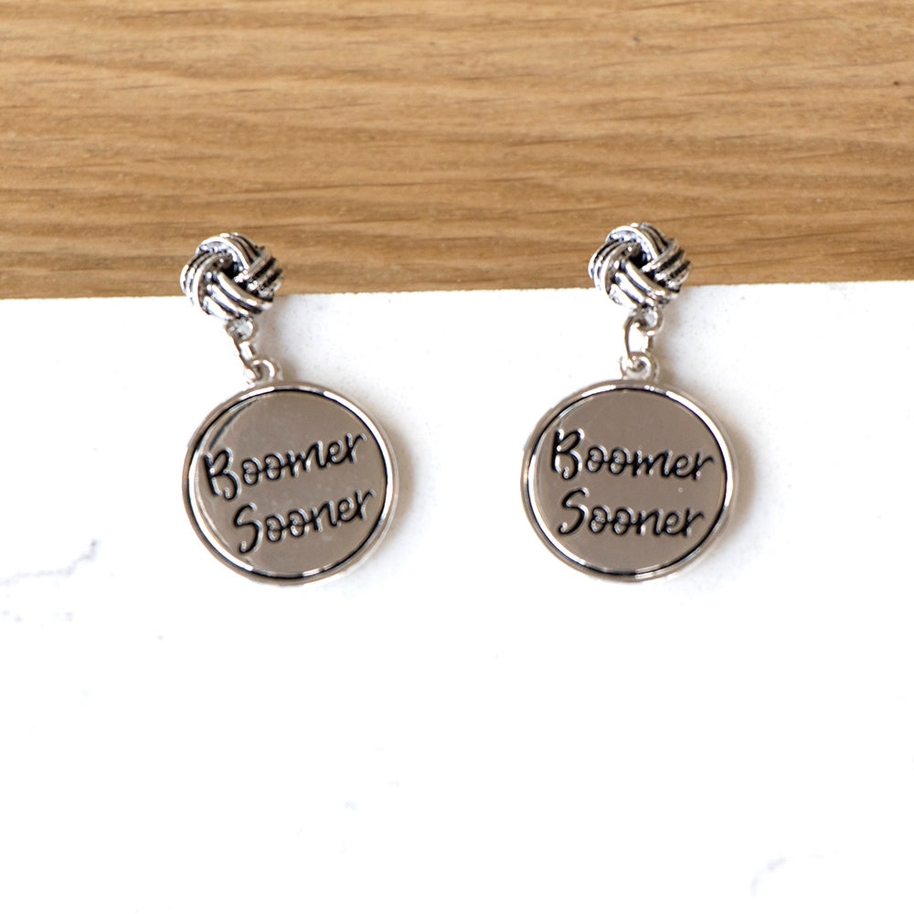 OU fans will love the classic styling of these Boomer Sooner Earrings. A silver knot holds an engraved disc that says Boomer Sooner. These earrings are officially licensed. $18