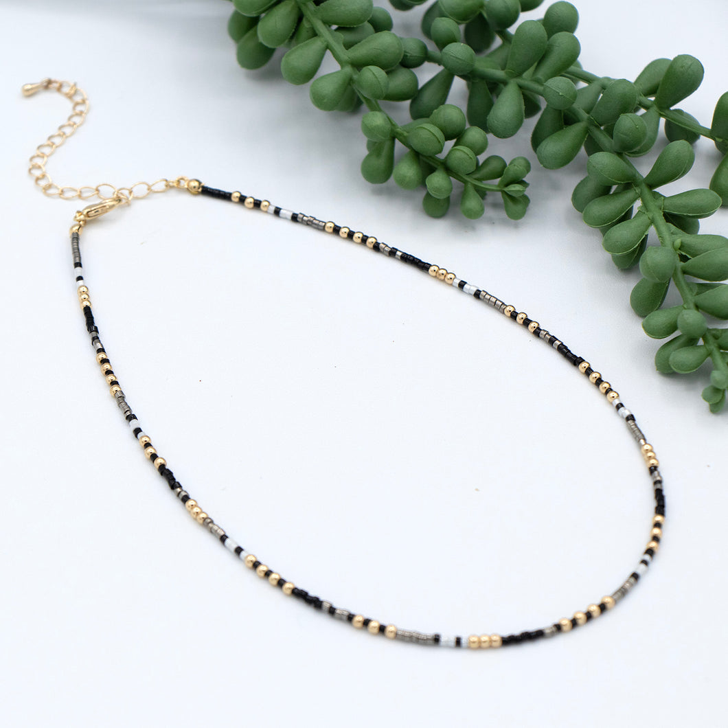 Black and gold seed beads are artfully arranged in our new Dani necklace. This simple necklace can be worn alone or layered with others for a bulked up look. It measures 16" in length plus a two inch extender. $20