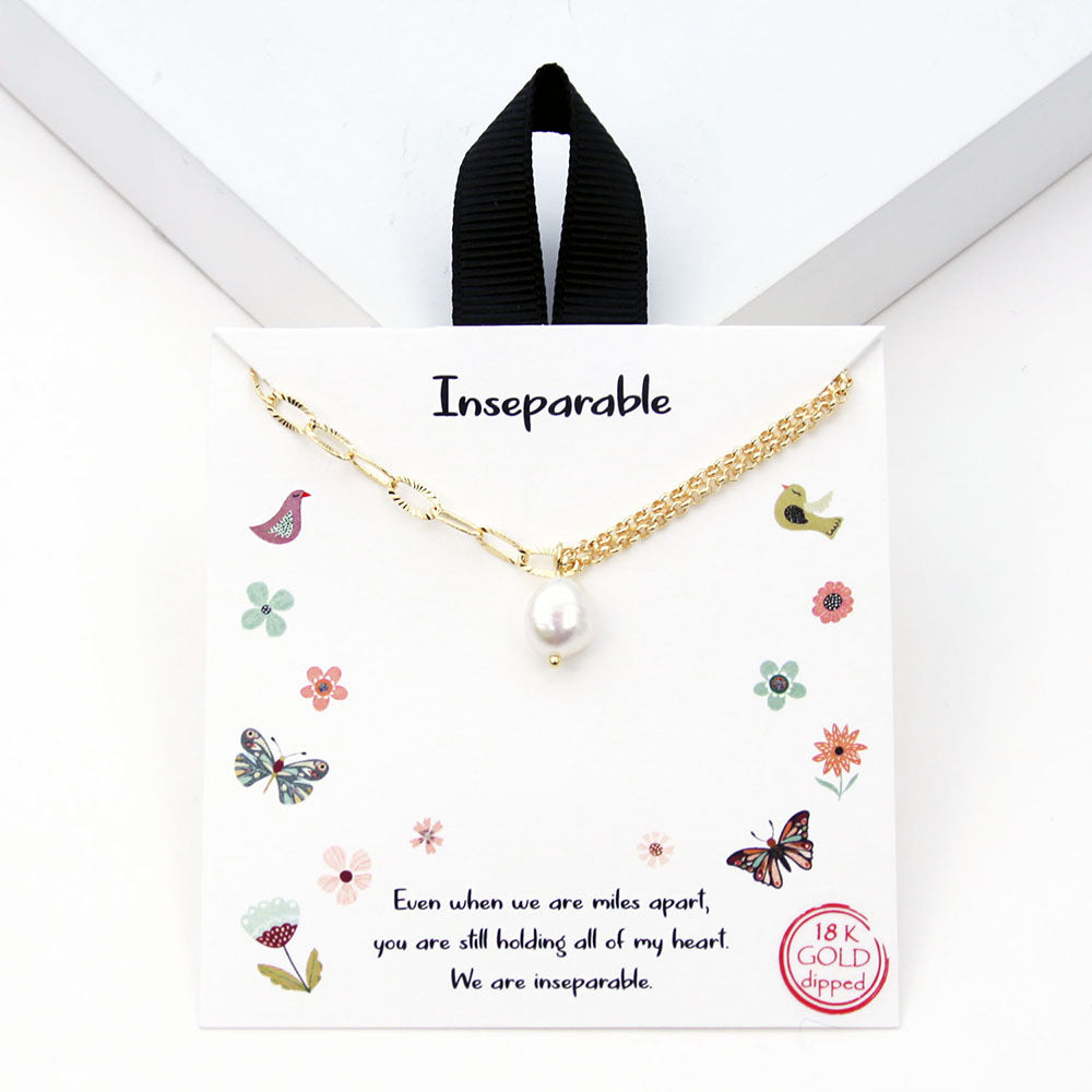 For the times when we are miles apart, our Inseparable Necklace makes us feel closer. This necklace features a glass pearl and gold plated over brass chain. It measures 16" plus a two inch extender and comes carded as shown. $24