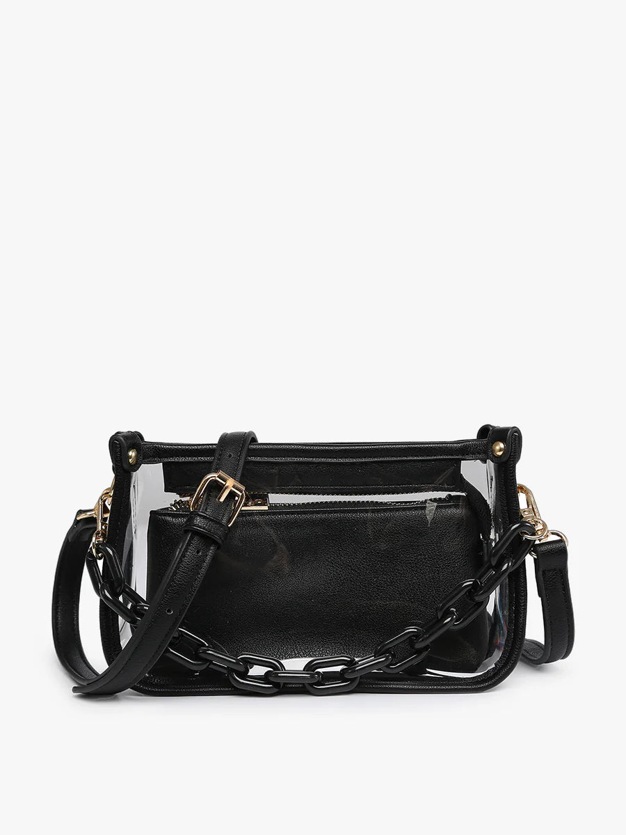 - Stylish chain strap complements the vegan leather trim for a sophisticated look.