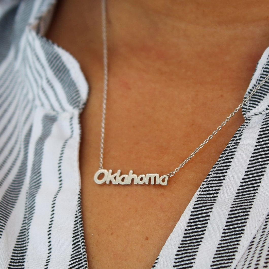 Nothing says local like our sweet petite Oklahoma necklace. A delicate Oklahoma pendant is suspended from chain in your choice of gold or silver. This necklace features an adjustable lobster claw closure that goes from 16" to 18" in length. $20